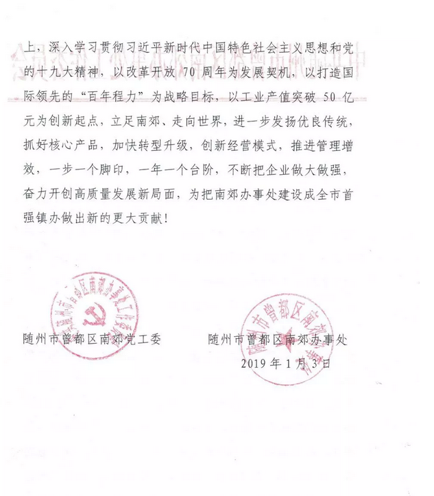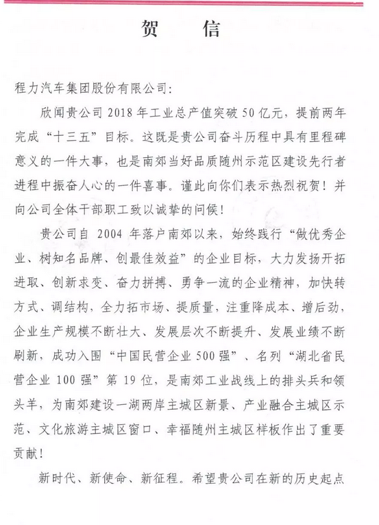 程力汽車集團股份有限公司2018年專汽產值突破50億,曾都區南郊黨工委南郊辦事處發賀信鼓勵