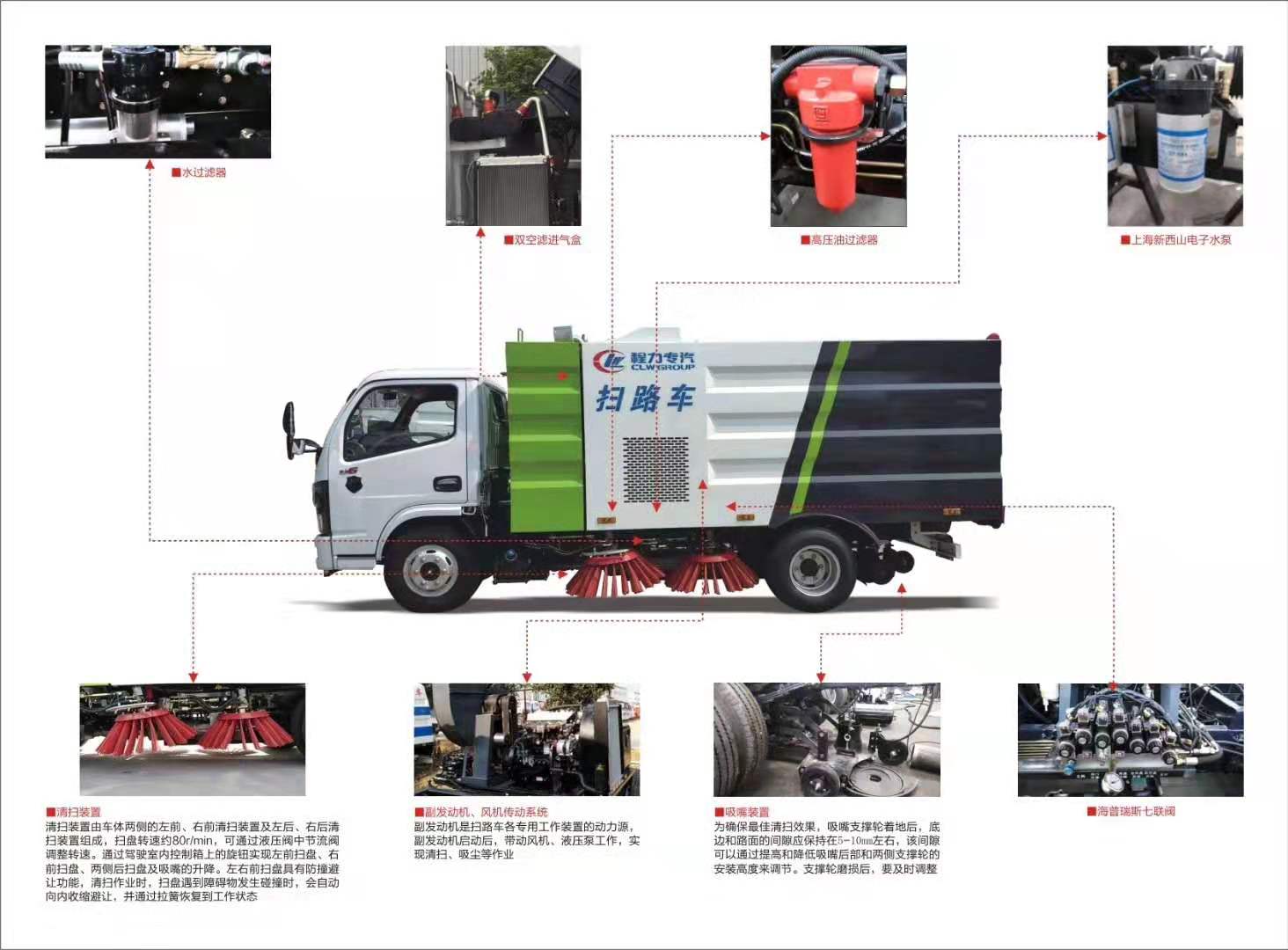 上裝標配:帶4個掃盤、江鈴78馬力副發動機、三洋馬達、施耐德控制開關、海普瑞斯電磁閥組、無級變速自動離合器、免維護離心式自動風機、不銹鋼垃圾箱、中聯北極星電子水泵,尾部LED箭頭指示燈、手動泵應急系統、垃圾舉升自卸功能。