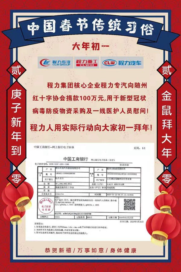 “各位程力家人,今年除夕我就不給大家發紅包了,我代表大家向隨州紅十字會捐獻100萬元。”大年初一,程力汽車集團董事長程阿羅的一則微信刷爆隨州人的朋友圈,他說,這是所有程力人的心意,將專項用于隨州新型冠狀病毒感染肺炎防治物資保障和醫護人員慰問。