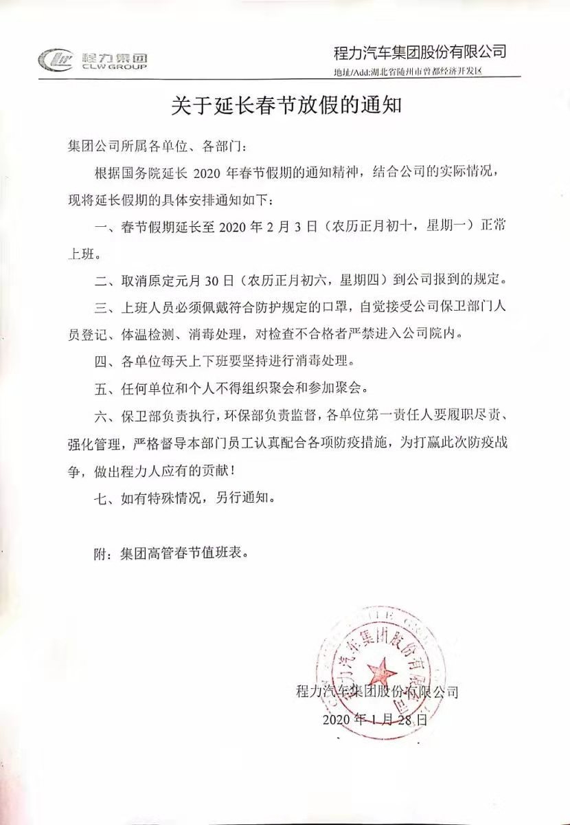 湖北程力汽車集團(tuán)關(guān)于延長2020年春節(jié)放假通知