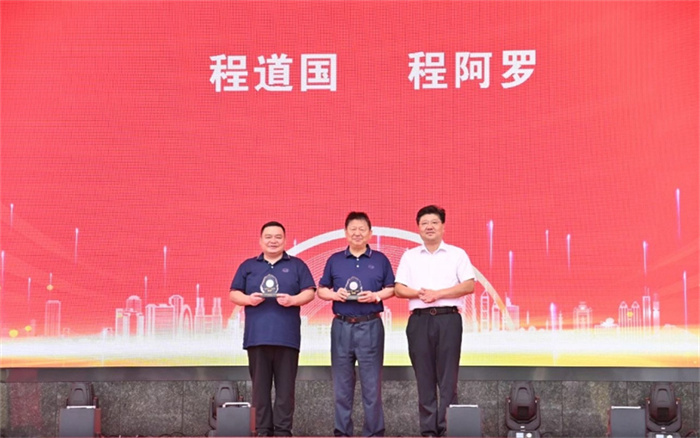 隨后,黃繼軍副市長(右)為程力公司創始人、集團董事局主席程道國先生,創始人、集團董事長程阿羅先生,頒發了企業發展功勛紀念獎章,表彰兩位企業負責人,為公司的發展艱辛創業、敢于創新,為隨州經濟社會發展,做出了卓越的貢獻。
