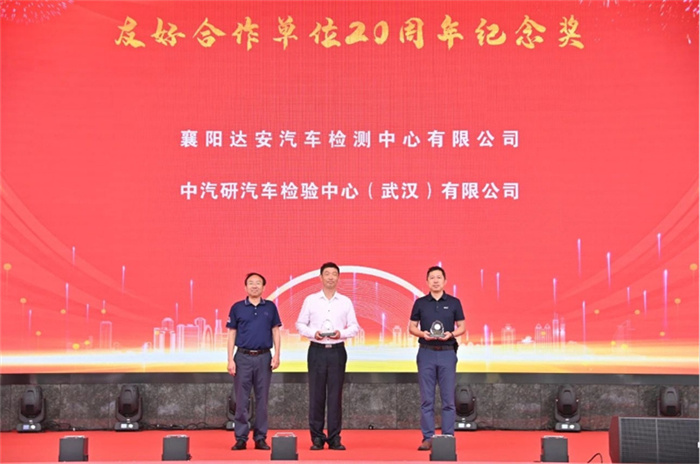 程力汽車集團副總經理倪文進(左)向檢測機構襄陽達安汽車檢測中心有限公司、中汽研汽車檢驗中心(武漢)有限公司代表,贈予了程力20年“合作紀念獎”獎章。