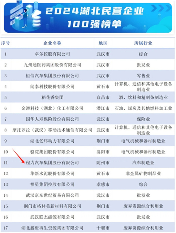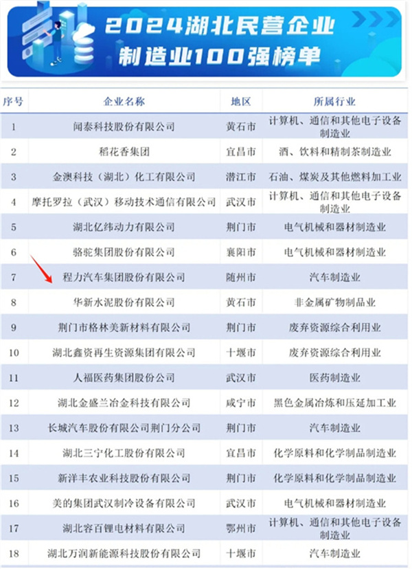 今天(10月31日)湖北省工商業(yè)聯(lián)合會發(fā)布2024湖北民營企業(yè)百強(qiáng)系列榜單這是湖北連續(xù)14年發(fā)布民企百強(qiáng)榜單,湖北發(fā)布2024湖北民營企業(yè)百強(qiáng)榜單,程力汽車集團(tuán)位列湖北民營企業(yè)百強(qiáng)11位,領(lǐng)先于同行。湖北省制造業(yè)名單程力汽車集團(tuán)股份有限公司百強(qiáng)第7位。