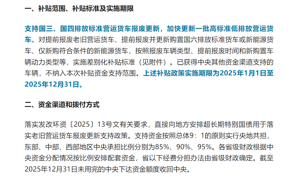 (下午)三部門聯(lián)合升級貨車更新政策:交通運輸部、發(fā)改委、財政部將老舊貨車補貼范圍擴展至國三/國四排放車輛,取消燃料類型限制。根據(jù)新規(guī),提前報廢并更換新能源貨車的企業(yè)最高可獲14萬元/車補貼,購置國六車型補貼7萬元。政策特別設(shè)置"綠色通道",對參與氫燃料電池車示范運營的企業(yè)額外給予3萬元運營補貼。支持資金按照總體9:1的原則實行央地共擔(dān)。