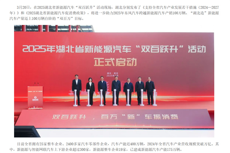 湖北分別發(fā)布了《支持全省汽車產(chǎn)業(yè)發(fā)展若干措施(2024—2027年)》和《2025湖北省新能源汽車促消費政策》,將進一步助力2025年“湖北造”新能源汽車產(chǎn)量邁上100萬輛臺階的目標。
