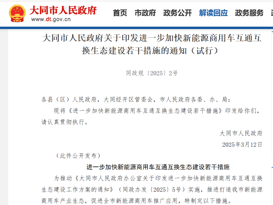 山西省大同市出臺《新能源商用車互通互換生態(tài)建設(shè)若干措施》,推出"三大攻堅計劃":公共交通全面電動化(2026年底公交車輛100%新能源化)、環(huán)衛(wèi)設(shè)備清潔化(新能源占比提升至60%)、重卡換電網(wǎng)絡(luò)化(新建50座智能換電站)。創(chuàng)新推出"車電分離"商業(yè)模式,通過標準化電池包設(shè)計實現(xiàn)不同品牌車輛換電兼容。計劃三年內(nèi)建成"風(fēng)光儲換"一體化示范項目10個,降低物流企業(yè)用能成本30%。