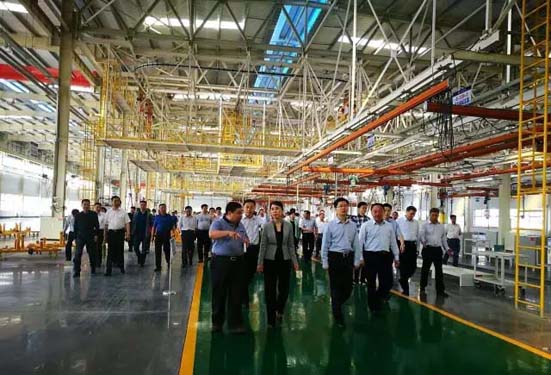 湖北程力集團總經理程阿羅(前排左一)、市委書記陳安麗(左二)、市長郄英才(前排右二)、曾都區區委書記何運平(右一),在程力商用車生產車間考察現場。