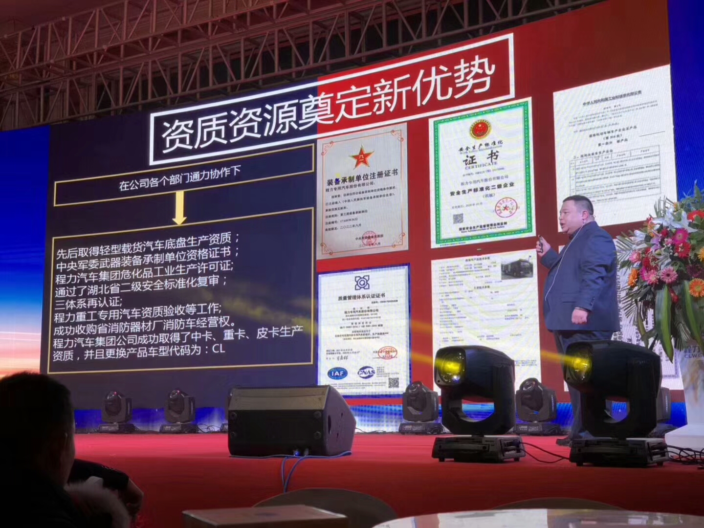 三、資質(zhì)資源奠定新優(yōu)勢: 在公司各個部門通力協(xié)作下,先后取得輕型載貨汽車底盤生產(chǎn)資質(zhì);中央軍委武器裝備承制單位資格證書;程力汽車就團危化品工業(yè)生產(chǎn)許可證;通過了湖北省二級安全標準復審;三體系在認證;程力重工專用汽車資質(zhì)驗收等工作;成功收購省消防器材廠消防車經(jīng)營權(quán);程力汽車集團公司成功取得了重卡、重卡資質(zhì),并且跟換產(chǎn)品車型代碼:CL