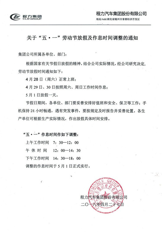 湖北程力汽車集團5.1勞動節(jié)放假通知