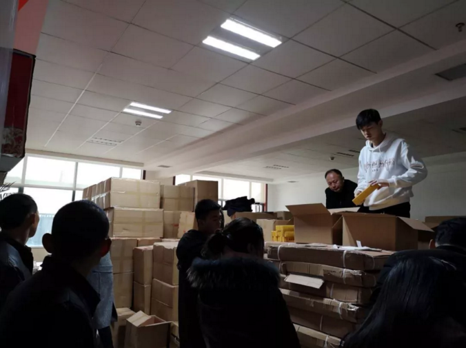 迎新賀年的精美禮品堆碼如山,分發的小伙子感覺到恐高癥了。