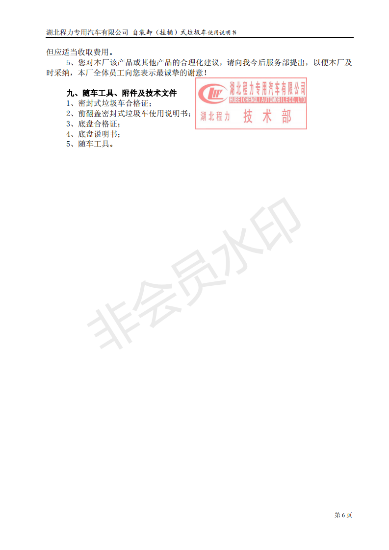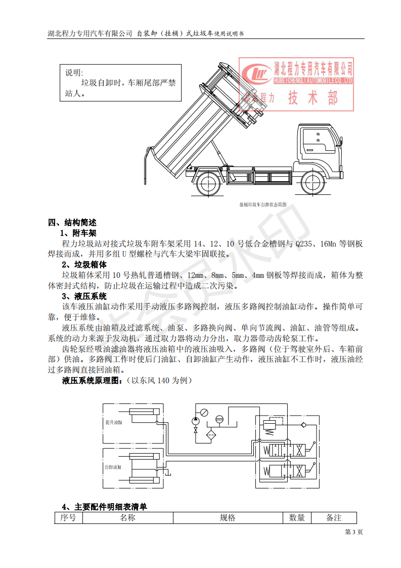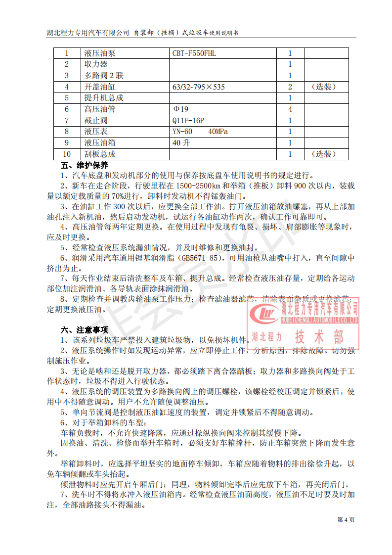 湖北程力專用汽車掛桶式垃圾車(以下簡稱掛桶式垃圾車或者勾臂式垃圾車)是用于城鎮內的垃圾收集、轉運、卸料作業的專用車輛。該車是由汽車底盤、自卸油缸、提升機總成、頂蓋(選裝)、附車架、垃圾箱體等組成。該車操作由液壓控制系統來完成,控制方式可以為手動或電氣控。該車主要用于城鎮垃圾的垃圾收集、轉運和卸料。操作開提升控制閥將垃圾桶隨提升機向上升起并翻轉傾斜,桶內垃圾被倒入車廂內完成垃圾單次裝載,反向操作提升控制閥,垃圾桶隨提升機而放下;完成垃圾裝載后再進行傾卸時,操作自卸控制閥,垃圾箱繞后翻轉軸傾斜體舉,箱體后門打開,垃圾傾卸出箱體;起該車由液壓控制系統來完成該車的提升機的上升和下降及垃圾的自卸功能,降低了工人的勞動強度和改善了工作環境。該垃圾車的收運方式是目前國內泛采用的垃圾收集轉運方式,其專用裝置的功能均以汽車發動機為動力,通過液壓機構手動或電控、氣控來實現。車輛的箱體采用優質炭鋼板全密封焊接結構,具有強度高、重量輕,防塵、防溢不產生二次污染等優點。垃圾車整車基本性能與原底盤車相同,用戶請參閱原底盤車使用手冊。本用說明書僅介紹專用改裝部分的有關操作、檢查和維修保養。在使用車輛前,我們強烈要求您能夠通讀本說明書,并對其中的操作程序做到得心應手。我廠對產品將會進一步改進。產品的改進、性能的提高、結構的不斷完善恕不另行通知,從而有某些說明不適用于您的特定車輛,敬請諒解。下面是湖北程力自裝卸式垃圾車(掛桶式垃圾車)使用說明書: