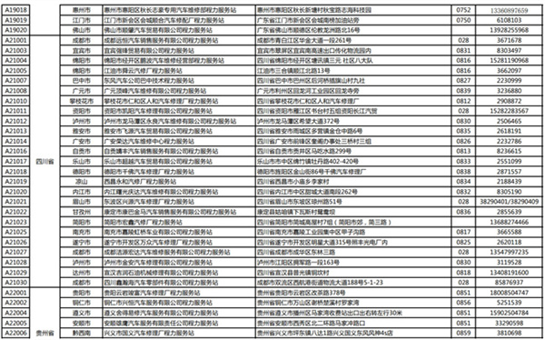 汽車廣東省、四川省、貴州省、服務(wù)站通訊錄: