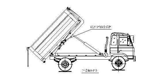 步驟5. 在卸垃圾前,整車運轉(zhuǎn)達到6個標準氣壓時掛上取力器,打開垃圾箱后門鎖緊裝置,在前級二聯(lián)多路閥處,首先確定鎖緊架鎖緊垃圾箱體(拉起鎖緊鉤操作手柄至鎖緊位置),然后拉起拉臂操作手柄至伸出位置,垃圾箱體備傾斜舉起垃圾卸出;如圖: