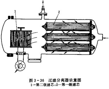 ②過濾分離器,為了獲得高潔凈度燃油,在管路中需加裝高性能的過濾分離器,將油中的水分,膠質(zhì)和雜質(zhì)分離出來,圖3-36為兩級過濾分離器。第一級濾芯2為聚結(jié)濾芯,由經(jīng)過特殊處理的濾紙或玻璃纖維,合成材料,毛氈、棉織品等制成。油流經(jīng)濾芯時,首先濾出的固體物質(zhì),再將膠質(zhì)分離,同時將分離出的小水粒聚集成大水滴,落入由外殼形成的集水器中,第二級濾芯1為分離器濾芯,表面涂有聚四氟乙烯的表面滑下,滴入集水池中,達到徹底分離水的作用。