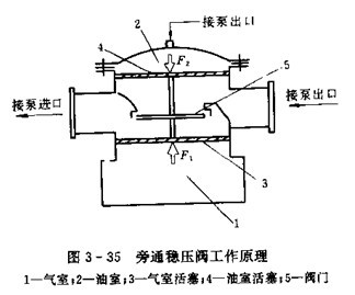 為旁通穩(wěn)壓閥的工作原理圖。氣室1內(nèi)充有一定壓力的空氣,上部油室2與泵的出口高壓油相通,氣室活塞3、油室活塞4與閥門5連成一體。在泵正常工用壓力下,氣室的氣體對活塞3的推力F1與油室油液對活塞4的推力F2相等,閥門5關(guān)閉不動,當泵出口壓力升高時,油室的壓力隨之升高,F(xiàn)2> F1,活塞在力F=F2-F1的作用下推動閥5下移,閥門被打開,泵的出口與入口油路接通,系統(tǒng)壓力被打開,泵的出口與入口油路接通,系統(tǒng)壓力開始下降,直至恢復原工作壓力,閥門又呈關(guān)閉狀態(tài)。