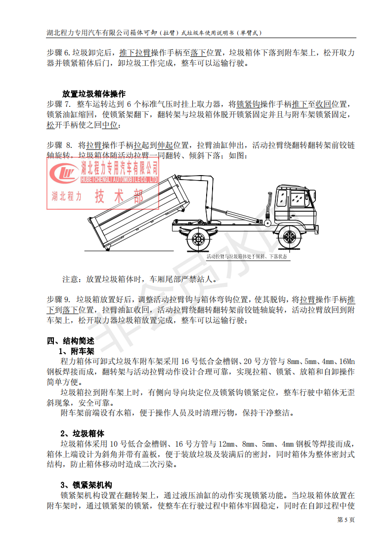 湖北程力車廂可卸式勾臂垃圾車使用說明書