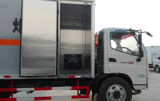 2、廂體分為兩部分:A:運輸炸藥;B:運輸雷管(防爆罐防爆箱);C:炸藥,雷管同時運輸(廂體必須隔倉,分倉運輸,加裝防爆罐防爆箱)。廂體為雙層金屬骨架結構,外部為冷扎鋼板,內壁采用鋁合金板蒙面,夾層為隔熱阻燃材料填充。設置對開門,如需安裝抗暴容器則增開側門,側壁設有防雨功能自然通風窗口,以使廂內外空氣流動,廂體內部做防靜電處理,廂體底部與廂內前部鋪有阻燃導靜電膠板,并與底盤等電位連接,通過車輛后端的導靜電裝置與大地相連,可防止靜電火花的產生和車輛靜電及時釋放,提高爆破器材運輸車的安全性。廂體內部前面和側面裝有固定拉環,與捆綁帶使用捆綁貨物以避免移動,保證安全。