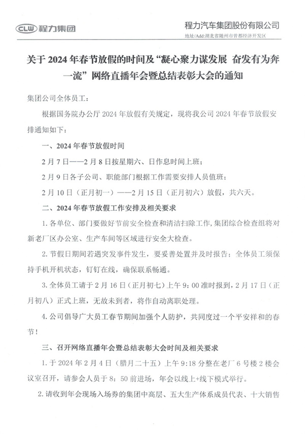 程力汽車集團關于2024年春節放假的時間及”網絡直播年會暨總結表彰大會的通知