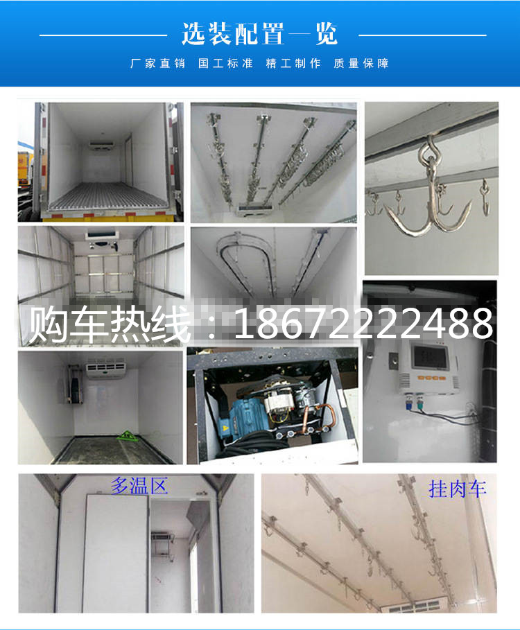 上裝配置: 箱體采用三明治結(jié)構(gòu),內(nèi)外采用冷藏車專用玻璃鋼(可反射陽光可選用不銹鋼),中間保溫層采用聚氨酯發(fā)泡隔熱材料,18米罐注一次成型,產(chǎn)品重量輕,漏熱率(導熱系數(shù))低,強度高,保溫效果好,廂體美觀大方扎實耐用。廂體厚度8CM.廂體全為不銹鋼鎖件,鋁合金包角,廂體可選裝通風槽、開側(cè)門等。根據(jù)需要可選裝配國內(nèi)外知名制冷機組(溫度達到保鮮或冷凍要求),可根據(jù)您的需求進行定制生產(chǎn)。